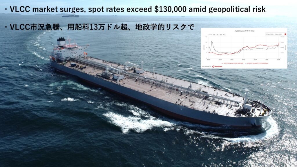 VLCC market surges, spot rates exceed $130,000 amid geopolitical risk VLCC市況急騰、用船料13万ドル超、地政学的リスクで