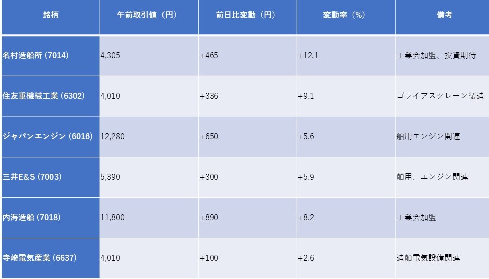 →23日午前の株式市場では名村造船所、住友重機械工業、ジャパンエンジンコーポレーション、三井E&S、内海造船、寺崎電気産業などの造船関連銘柄が急騰している。