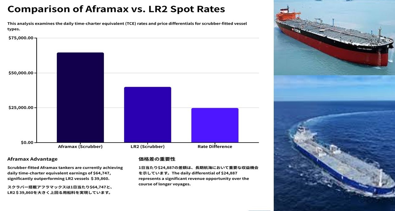 アフラマックスのスポット用船料が急騰している。Signal Oceanなどのデータによると、スクラバー搭載アフラマックスは1日当たり64,000ドル強と、LR2(スクラバー)の約40,000ドルを大きく上回り、1日当たり24,000ドル強の値差が発生している。