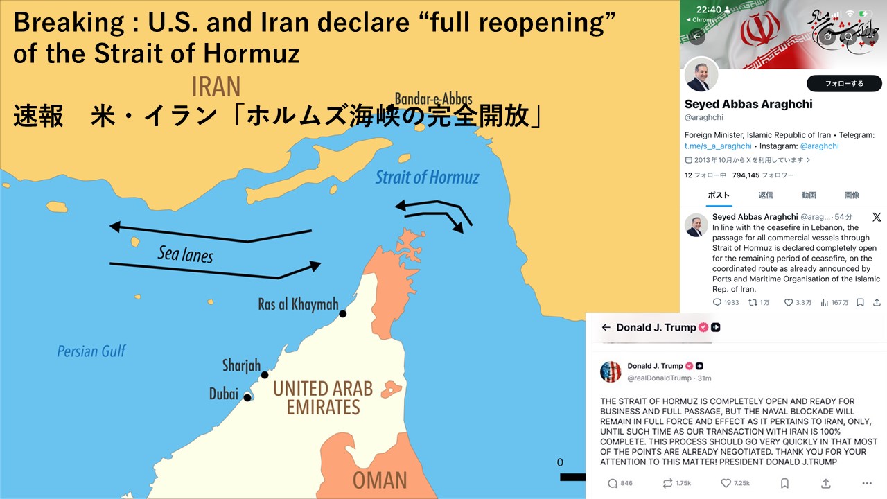 Breaking : U.S. and Iran declare “full reopening” of the Strait of Hormuz 速報 米・イラン「ホルムズ海峡の完全開放」