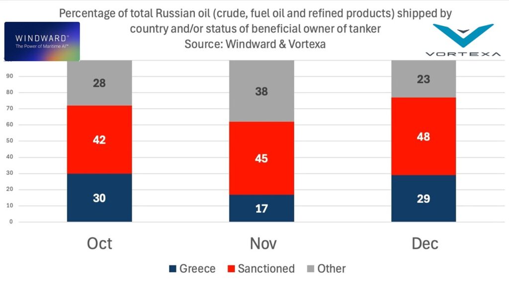 Windwardとエネルギー商品トラッカーのVortexaのデータによると、ロシア産原油輸送におけるEU所有タンカーのシェアが2025年12月に大きく回復した。