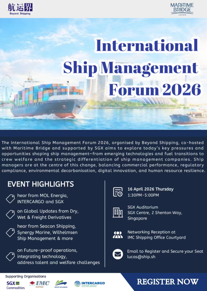 Beyond Shipping(航运界网)は4月16日、シンガポール証券取引所(SGX Centre)で「International Ship Management Forum 2026」を開催する。昨年に続き2回目の開催で、テーマは「Future Ready Ship Management: Sustainability, Technology, and Human Capital(未来志向の船舶管理:持続可能性、テクノロジー、人材)」。Maritime Bridge Japanは本カンファレンスのメディアパートナーとして参加する。Singapore Maritime Week 2026を前に、船舶管理を巡る主要課題を議論する場となる。入場は無料、参加申し込みは下記メールアドレス、もしくはサイト内のQRコードからご登録ください。