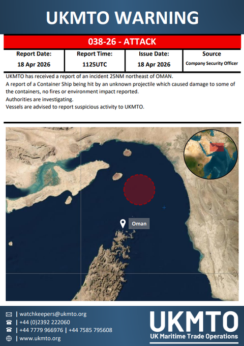 The United Kingdom Maritime Trade Operations (UKMTO) said on April 18, 2026 that it had received a report of an incident that occurred approximately 20 nautical miles northeast of Oman.