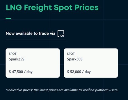 → The current LNG carrier spot market stands at $52,000 per day on “Spark30S”, the index published by Spark Commodities assuming latest-generation two-stroke vessels (MEGI/X-DF type), while “Spark25S”, which assumes older-generation TFDE vessels, is hovering around $47,500 per day.