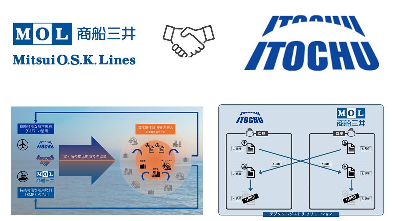 商船三井と伊藤忠商事は9日、運輸セクターの脱炭素化推進を目的とした環境属性証明書の活用に関する戦略的提携の覚書(MoU)を締結したと発表した。