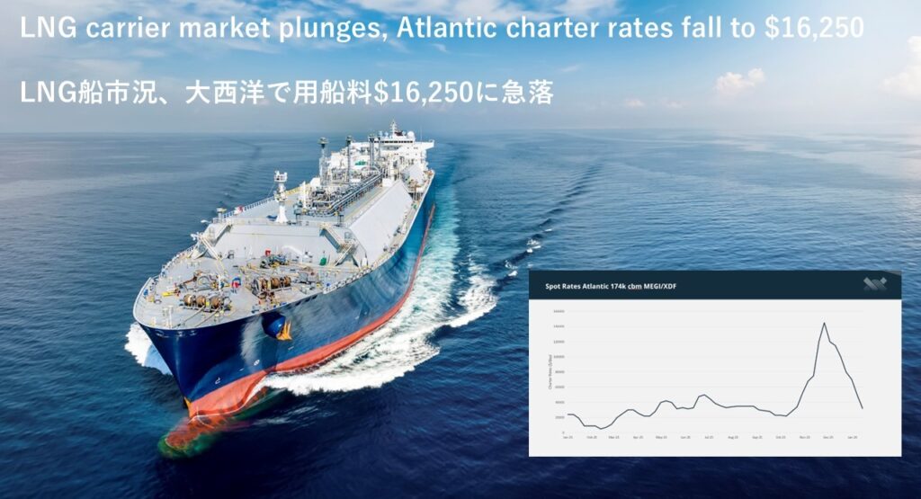 LNG carrier market plunges, Atlantic charter rates fall to $16,250 LNG船市況、大西洋で用船料$16,250に急落