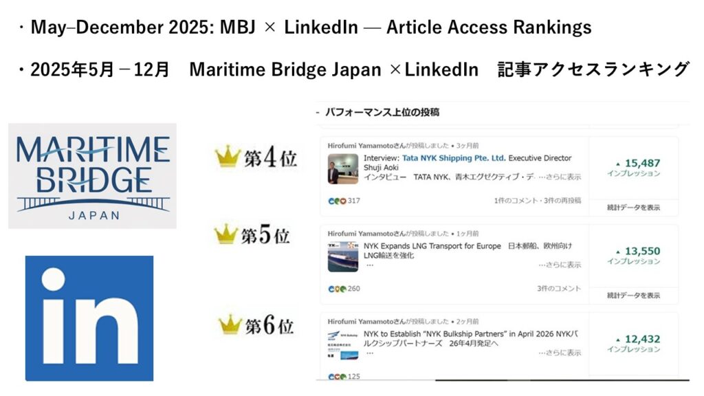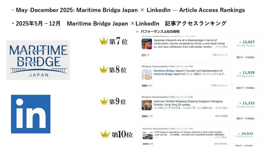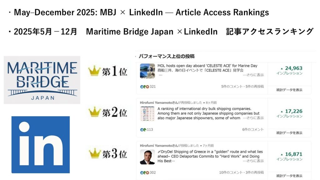MBJ × LinkedIn Article Access Ranking (No.1–No.3) Shipbuilding, energy and people — where did readers’ interests turn? 1 May 2025 – 1 December 2025 MBJ×LinkedIn 記事アクセスランキング(第1位-第3位) Maritime Bridge Japan (MBJ) compiled... -