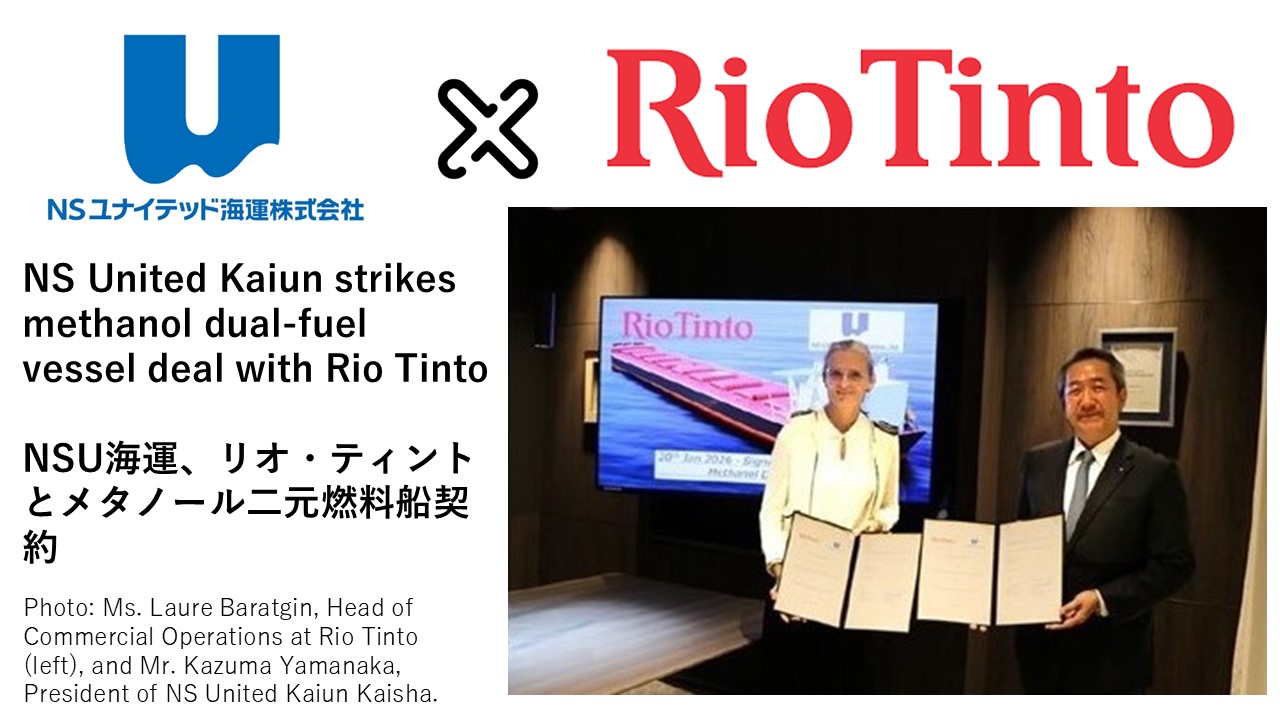 NSユナイテッド海運は、英豪資源メジャーのリオ・ティント(Rio Tinto)と20万9,000重量トン型のメタノール二元燃料船2隻に関する輸送契約を締結した。
