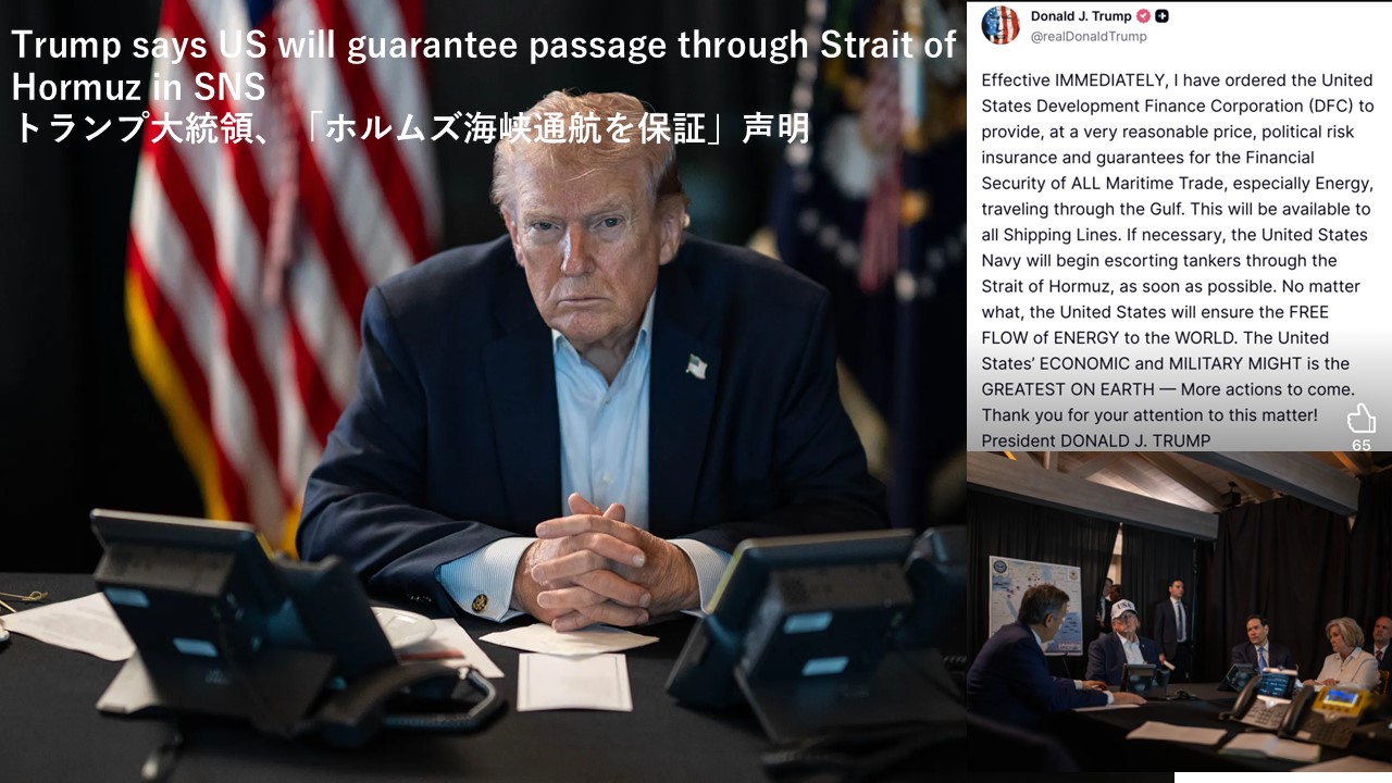 Trump says US will guarantee passage through Strait of Hormuz in SNS トランプ大統領、「ホルムズ海峡通航を保証」声明
