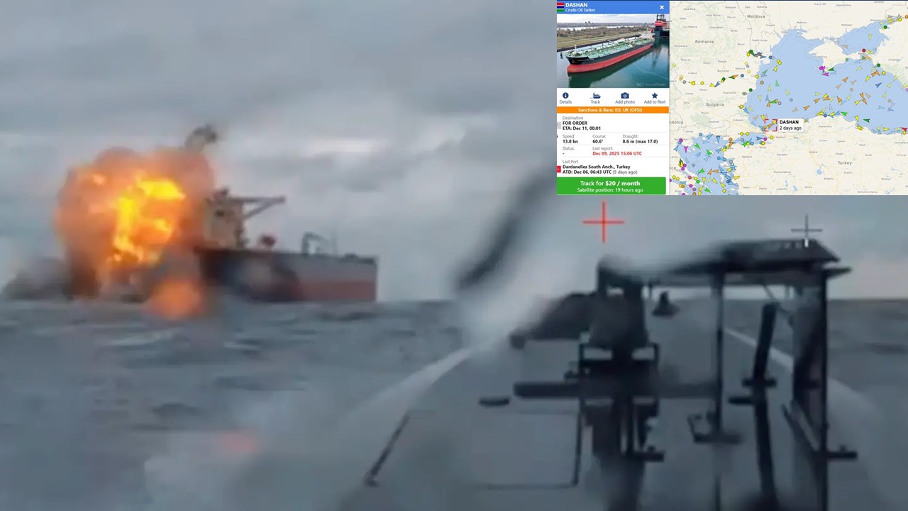 → Footage released by the SBU shows flames and thick black smoke engulfing the stern, and preliminary assessments described the tanker as “unusable.” The attack marks the third Ukrainian strike on a shadow-fleet tanker within the past two weeks, further destabilising the safety of navigation in the Black Sea.