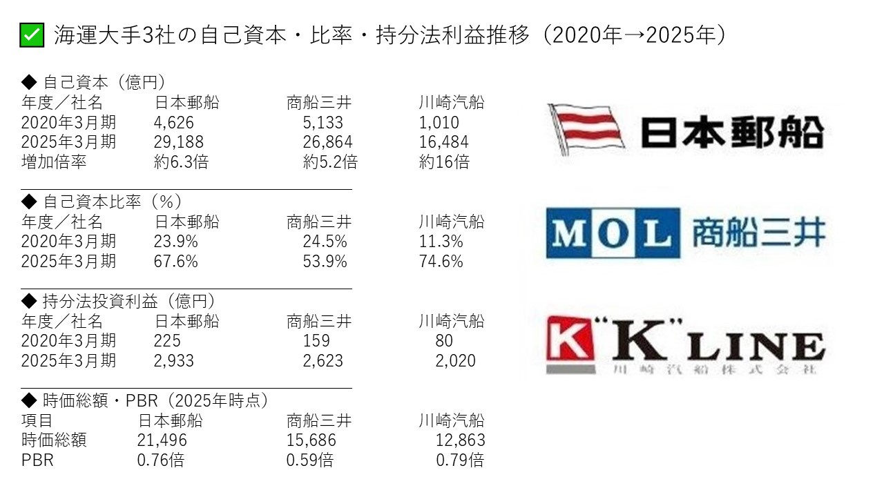 →海運大手3社のPBRは0.59倍~0.79倍と指標となる1倍を割り込む。実は、これは海運大手の投資家の評価や株価が低い訳ではなく、海運大手3社の自己資本が2020年3月期から2025年3月期の5年間で5倍から最大16倍まで急増したためである。
