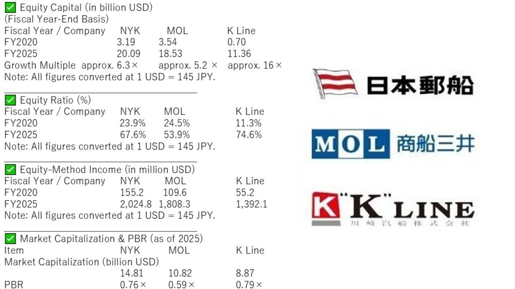 → Since 2020, there has been no sector among other heavy industries such as steel, electric power or oil—industries classified alongside shipping as “heavy and large-scale”—that has seen such a dramatic increase in equity capital. The current PBR levels of the three major shipping firms can be described as the result of the exceptional performance they have accumulated over the past five years, a rarity even on the TSE Prime Market.